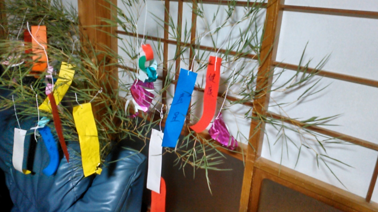 ひと月遅れの七夕様です。昨日は、風が強くて外はやめて、家の中に飾りました。