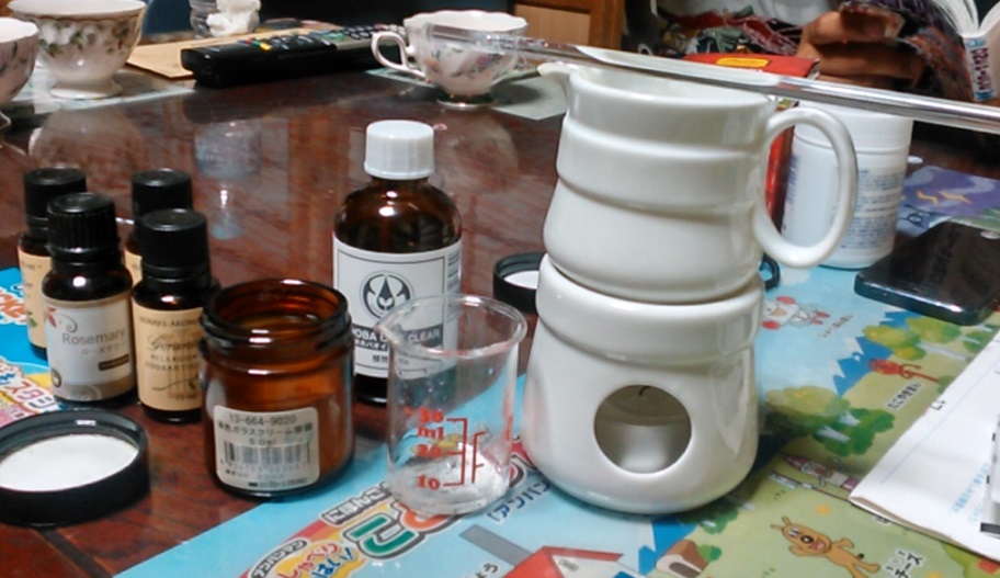 いつも、お友達に道具一式借りてミツロウクリームを作っていますが、今回は、初めて自分で作ってみた。いつもは、友達とワイワイ賑やかに作っていますが、この日は、娘と娘の旦那さんとわいわい言いながら、その傍らで息子がワンピースのまんがを読んでいる中作った。
